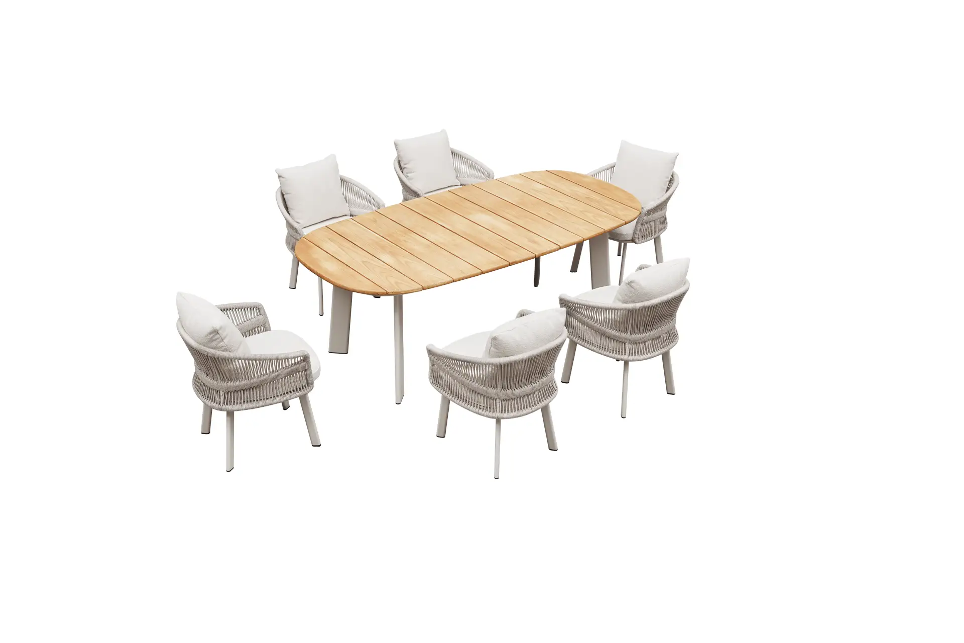 The Aio 6-seater outdoor dining table set is ideal for long lunches on warm evenings entertaining friends and dining al-fresco. The elegant cream table frame is complimented by a teak top, and the six dining chairs feature cream rope detail and off white cushions. Garden furniture that is guaranteed to make the right impression.