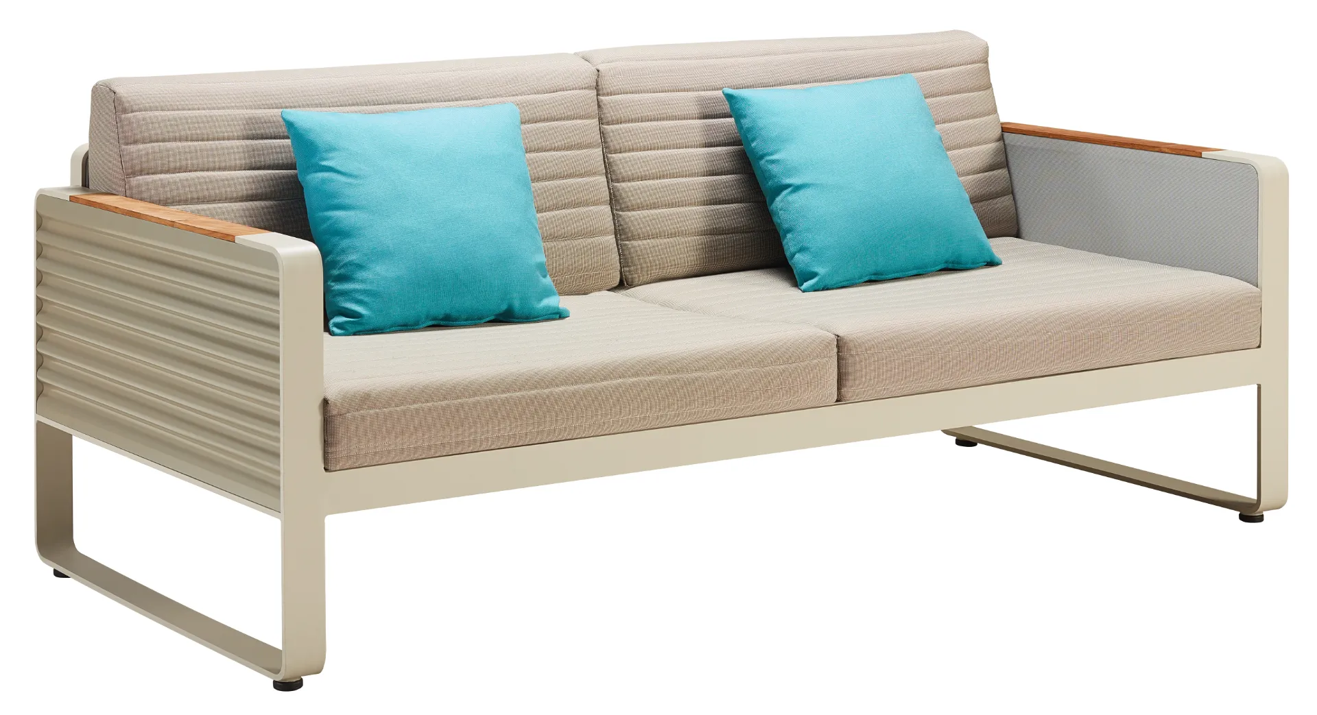 A contemporary outdoor sofa set comprising a double sofa, two comfortable armchairs, an outdoor coffee table and a smaller side table. This garden furniture would enhance any outdoor space, providing comfortable and stylish seating. It has an aluminium frame champagne colour with beige cushions.