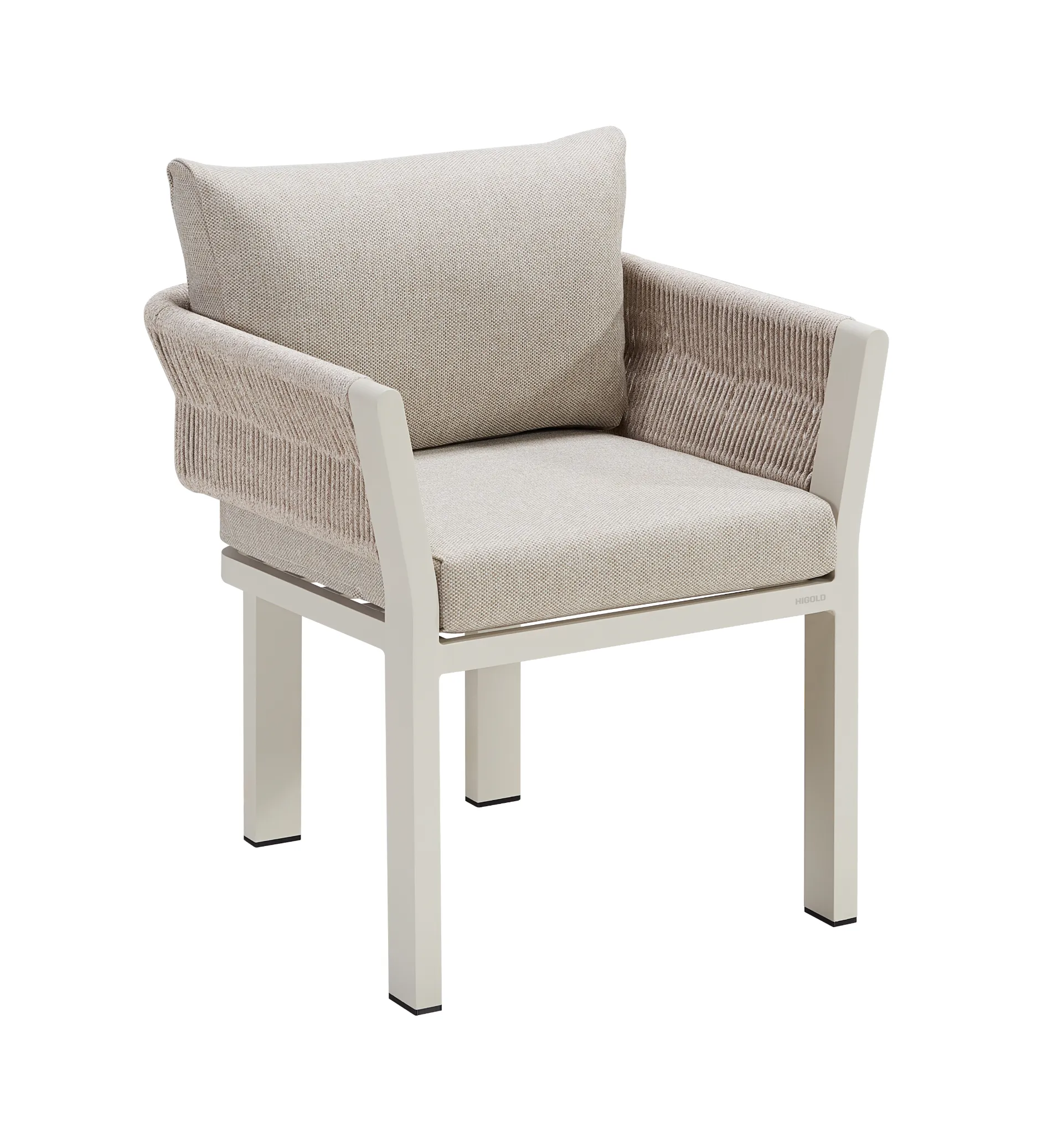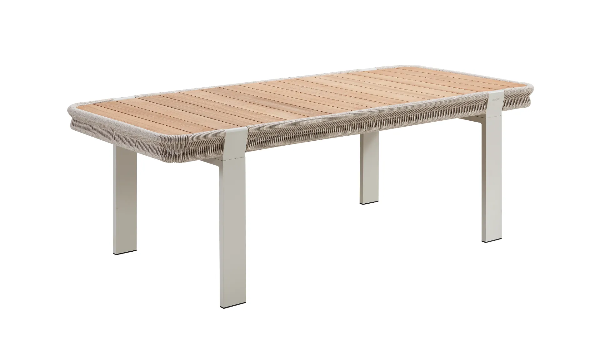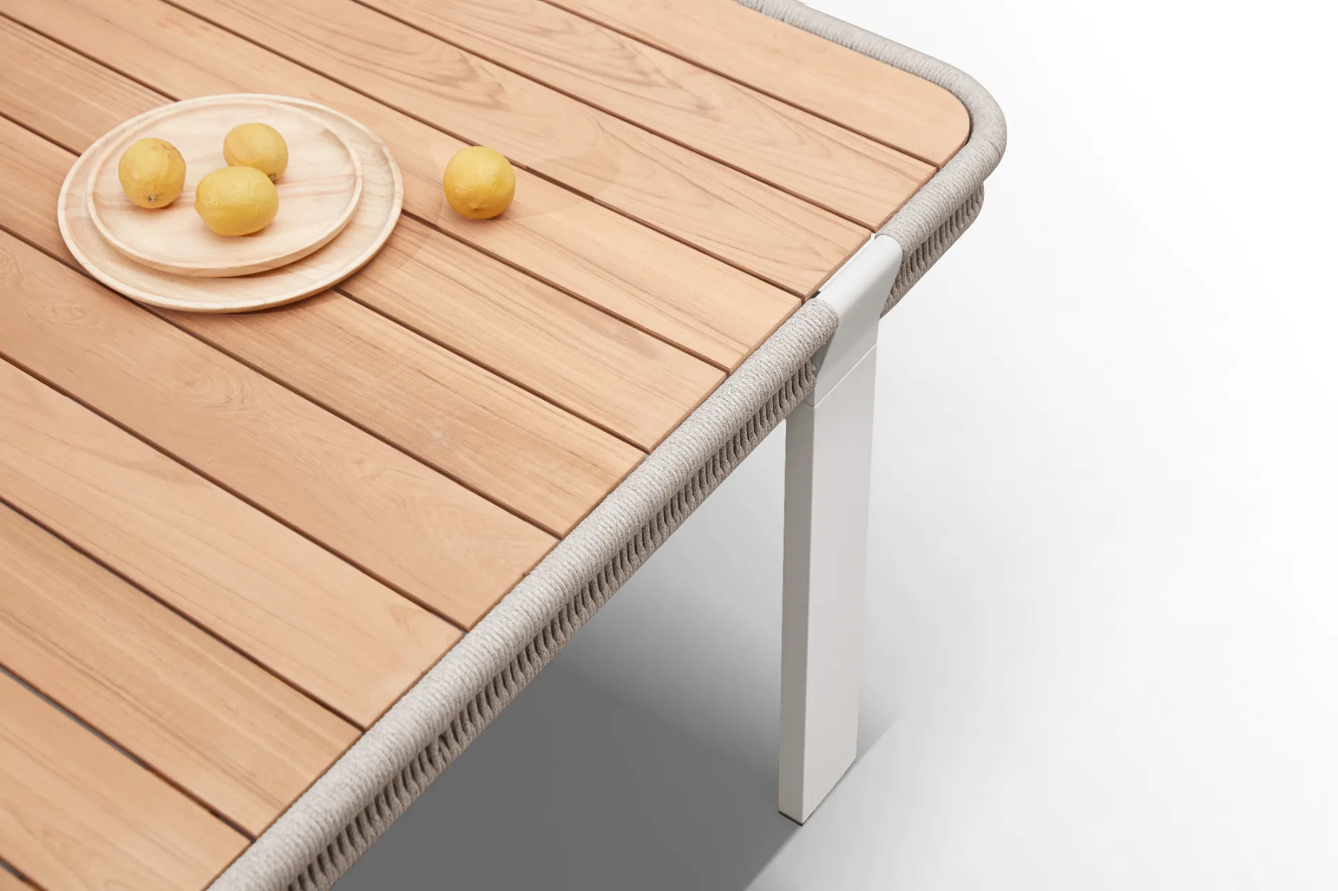 The must-have outdoor furniture set for luxury outdoor living, this 6-seater outdoor table set comprises a large outdoor dining table and 6 dining chairs. This high-quality aluminium garden furniture is available with a beige frame and plump beige cushions with taupe ropes. The table features a durable teak top.