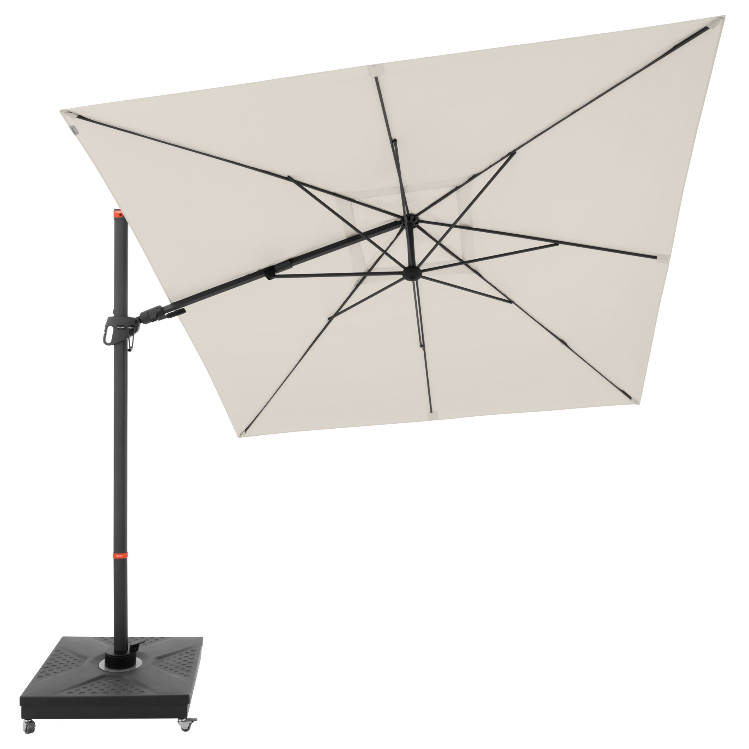 The cantilever umbrella features a large square canopy that can be tilted in seven positions, swivelled axially in both directions, and rotated 360 degrees. It is equipped with a robust aluminium