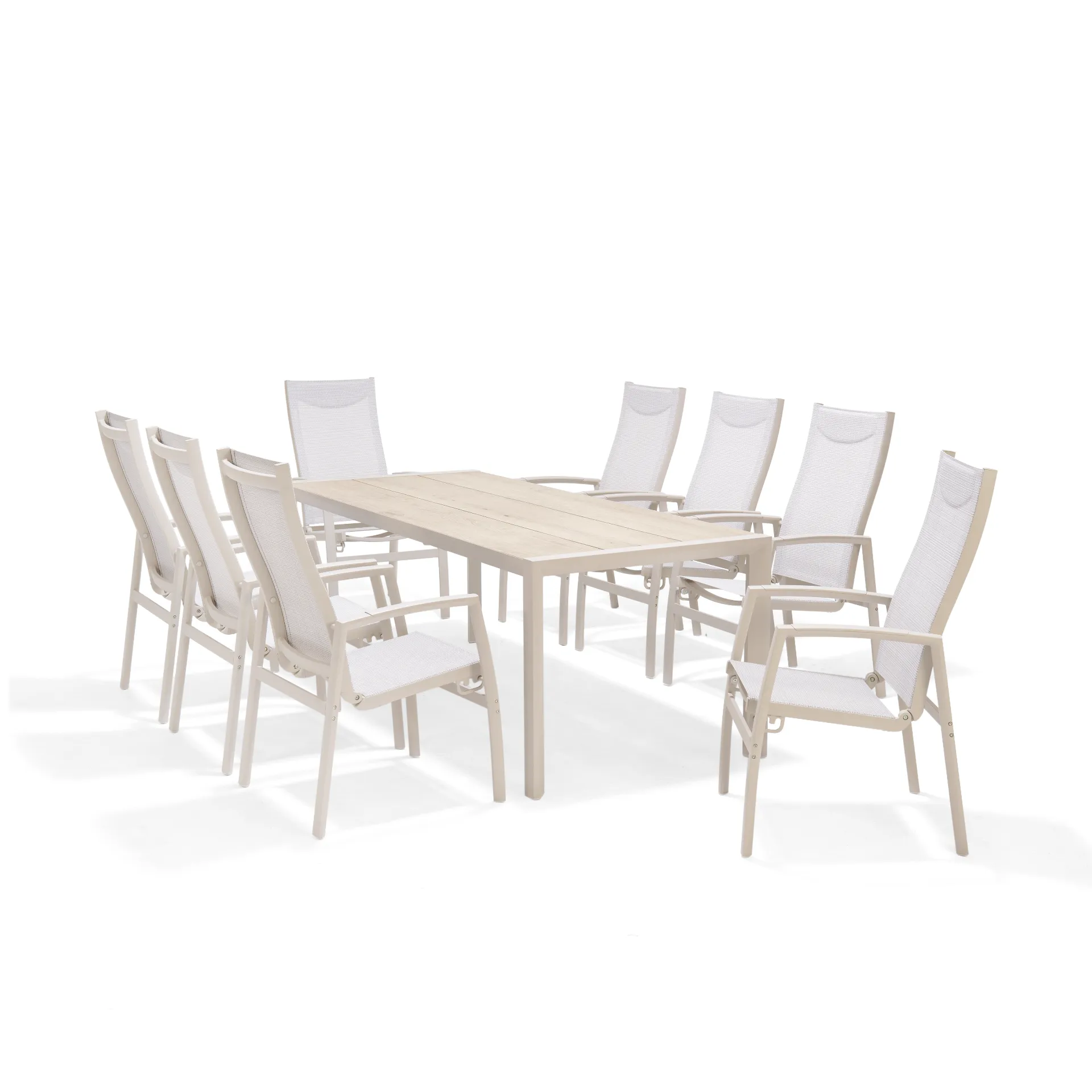 This large 8-seater outdoor dining table and 8 matching high stackable chairs is part of the contemporary Urbanite outdoor furniture collection. Designed to provide a modern, light, bright and functional addition to your patio, terrace or garden. The perfect outdoor dining table for entertaining and al-fresco dining.